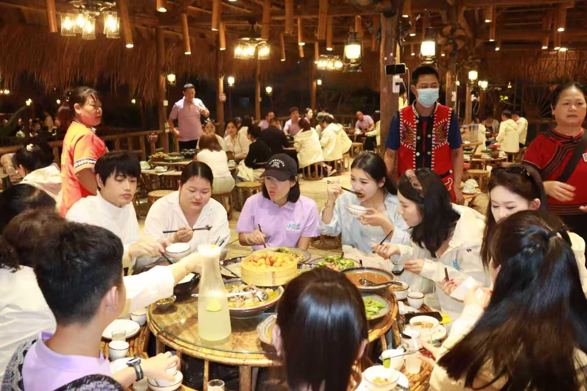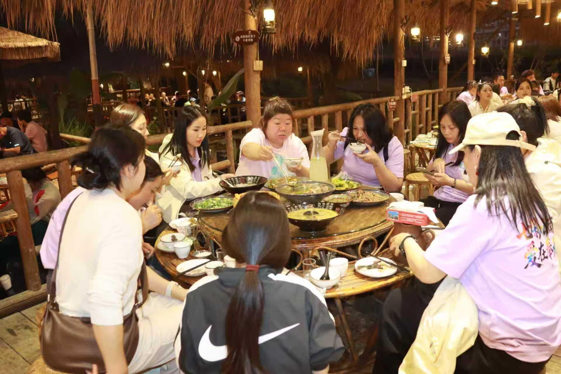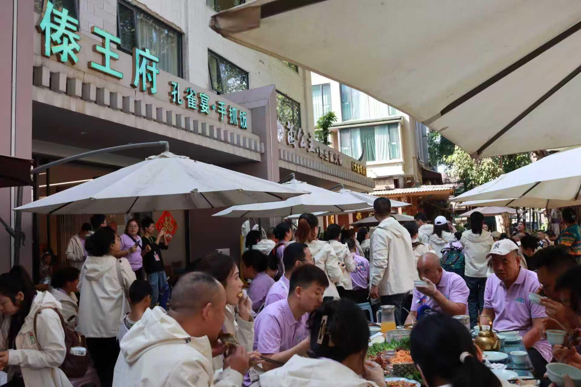 中午午餐时间,大家来到了傣王府孔雀宴餐厅,享用了傣族特色美食--孔雀宴。