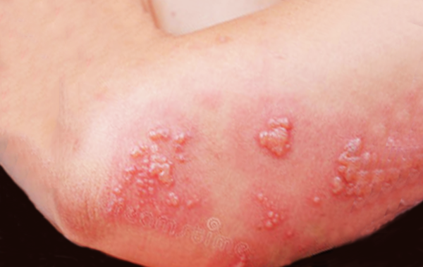 带状疱疹:由水痘-带状疱疹病毒引起,皮疹呈带状分布,通常发生在身体的一侧。表现为沿着周围神经走向成群分布的水疱,疼痛。
